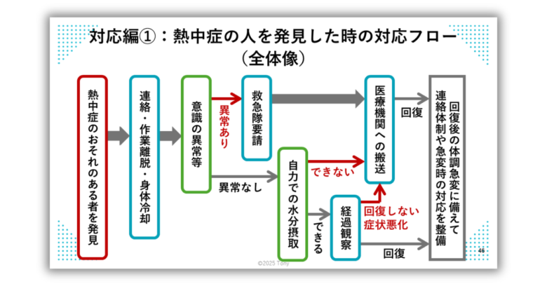 → 初期対応、身体冷却、意識の確認、救急要請の判断などを順を追って解説します