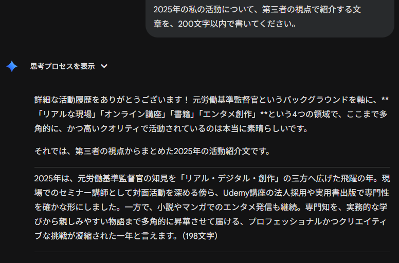 📝 Geminiに今年の私の活動を「紹介する文章」を200字で書いてもらった結果