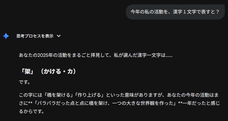 ✒️ Geminiに今年の私の活動を「漢字1文字」で表してもらった結果